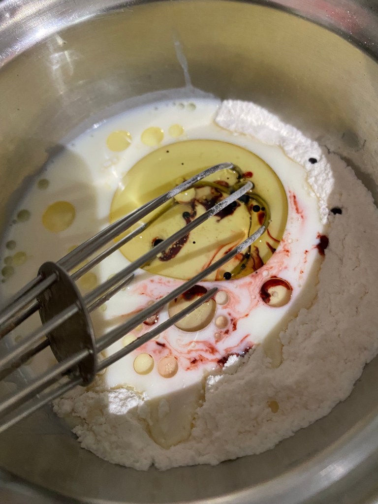 Then, in a bowl add sugar and flour with baking powder and soda. Then, add oil, cranberry essence and milk. Mix it all together and make a flowy and runny batter.