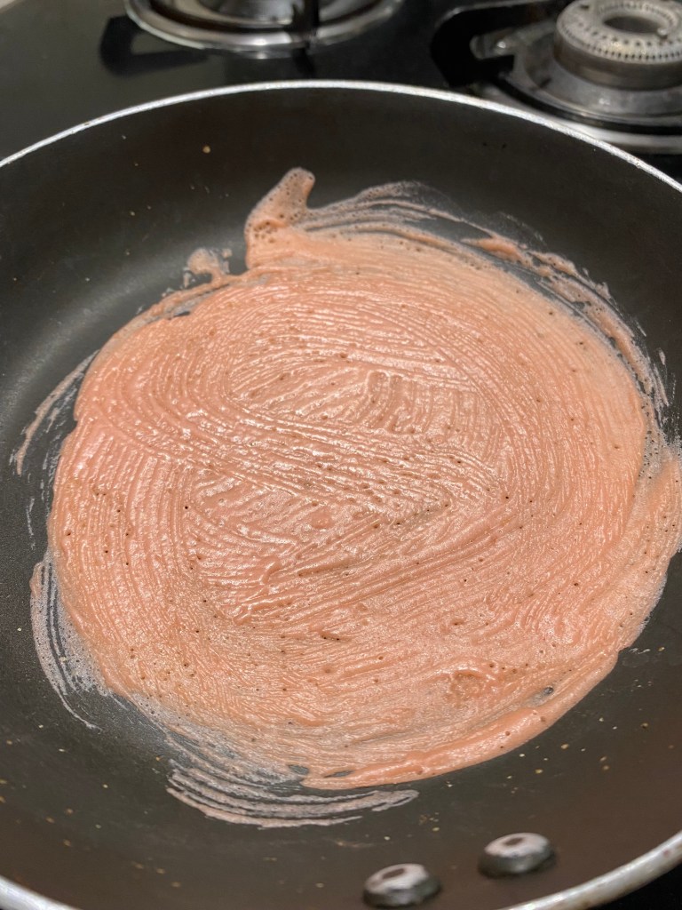 Place a pan on low heat and immediately add two tbsp of this batter. Take a silicone brush and spread the batter evenly on the pan on low heat.