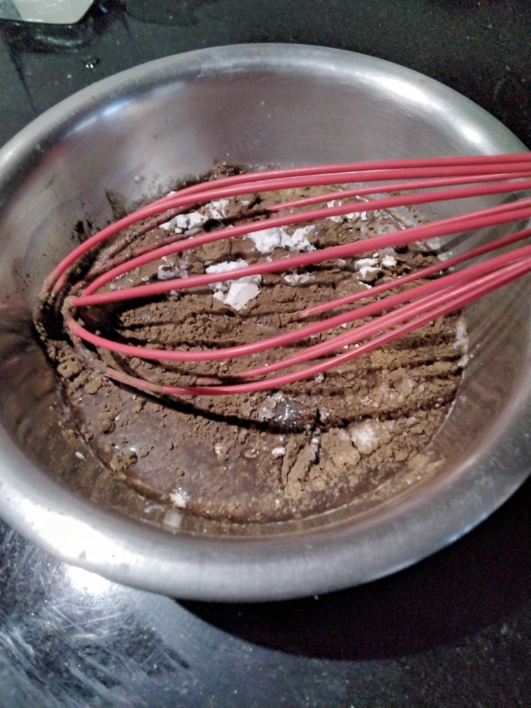 In another bowl, add the 1/3 cup milk, cornflour, cocoa powder and sugar.