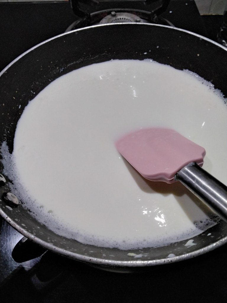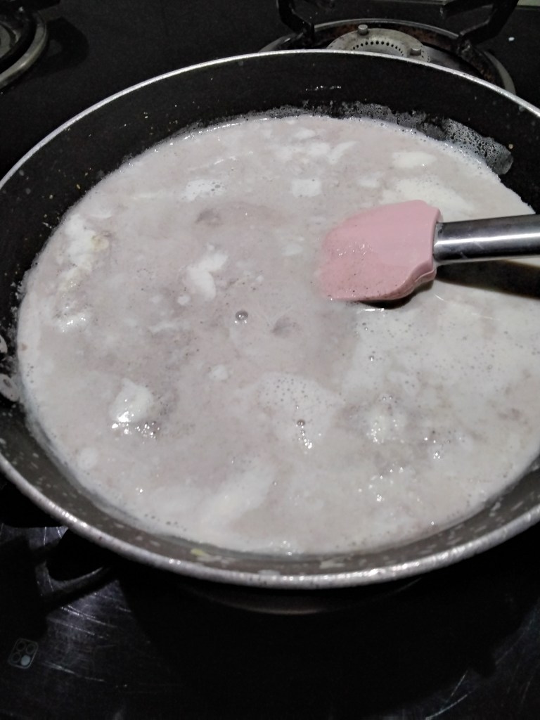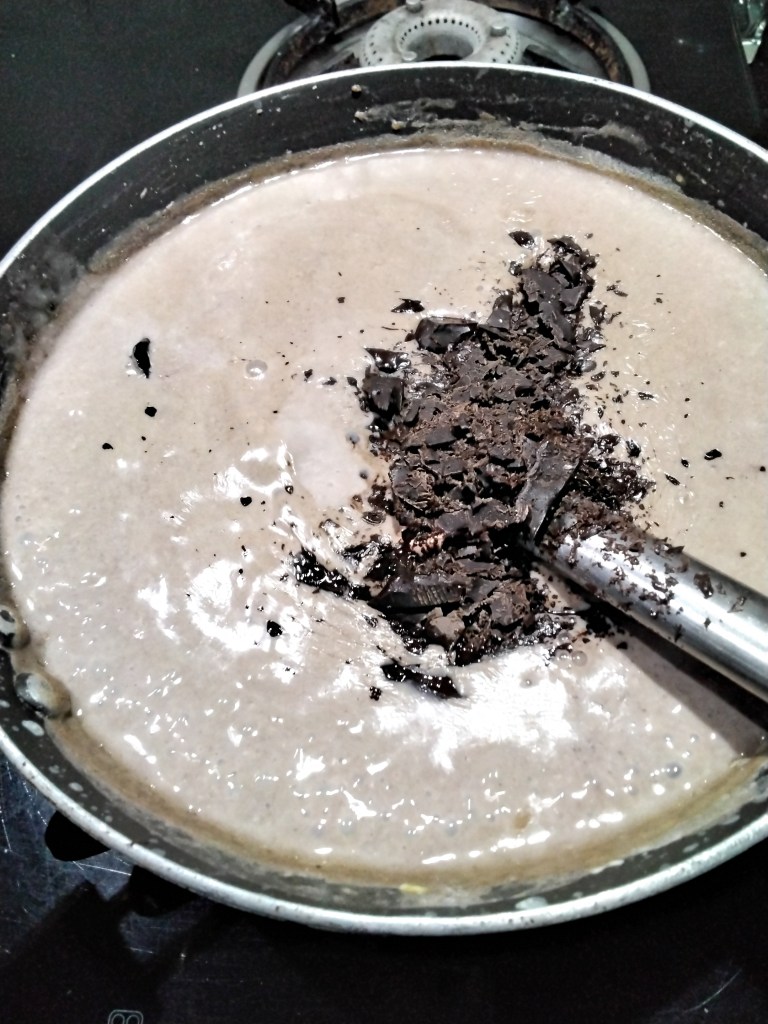 Give it a good mix and add it to the boiling milk. Add the condensed milk and chocolate to this.