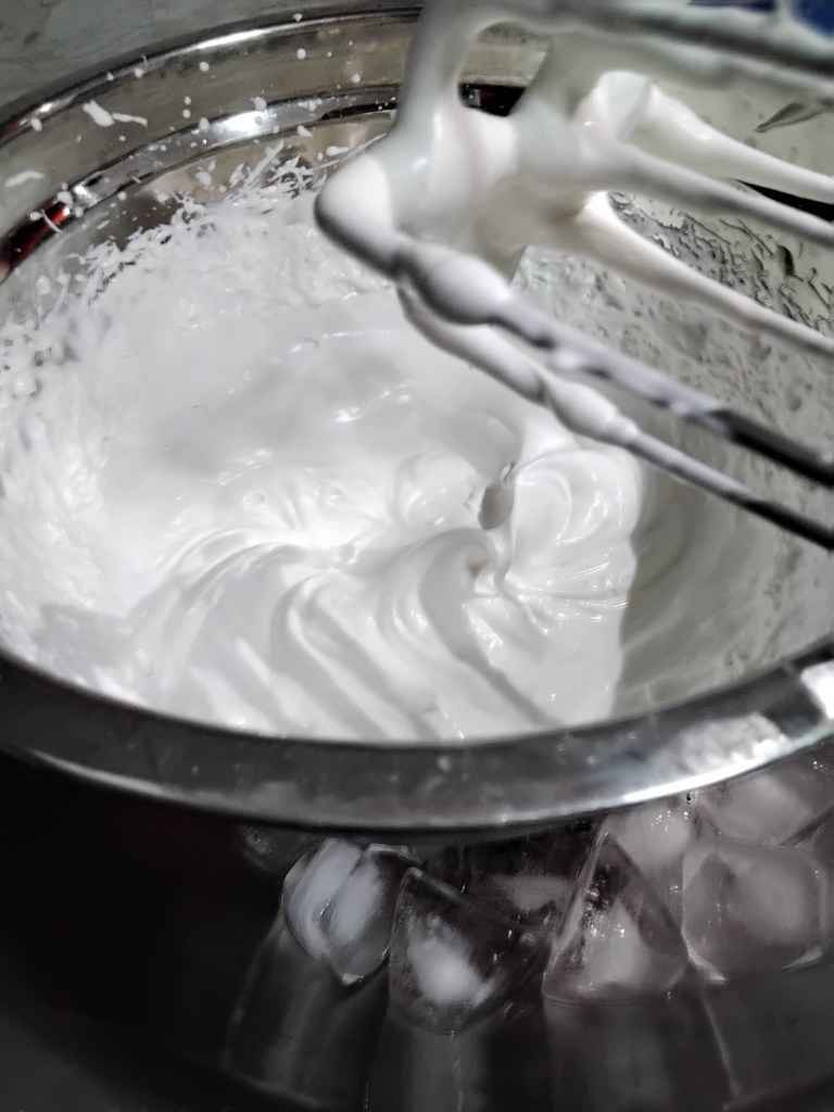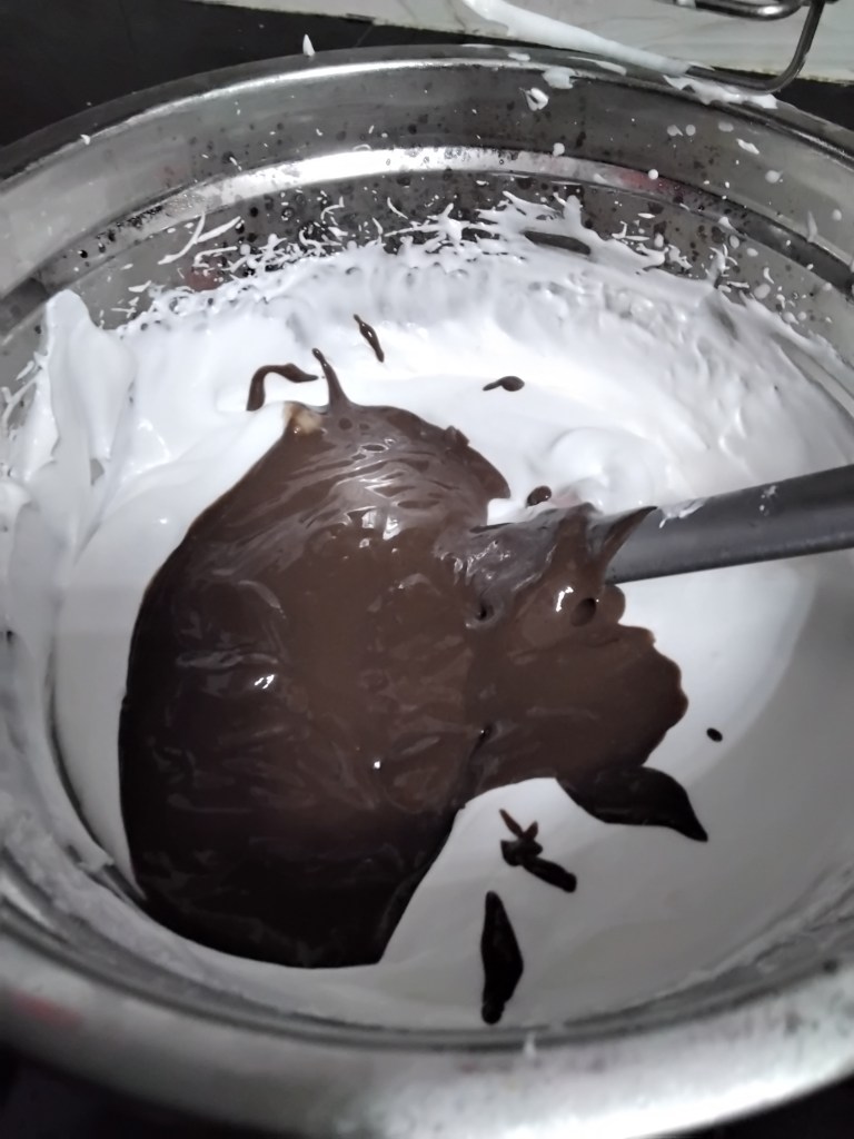 Whip it until stiff peaks come on high speed. Add the cooled down mixture prepared earlier along with chocolate chips.