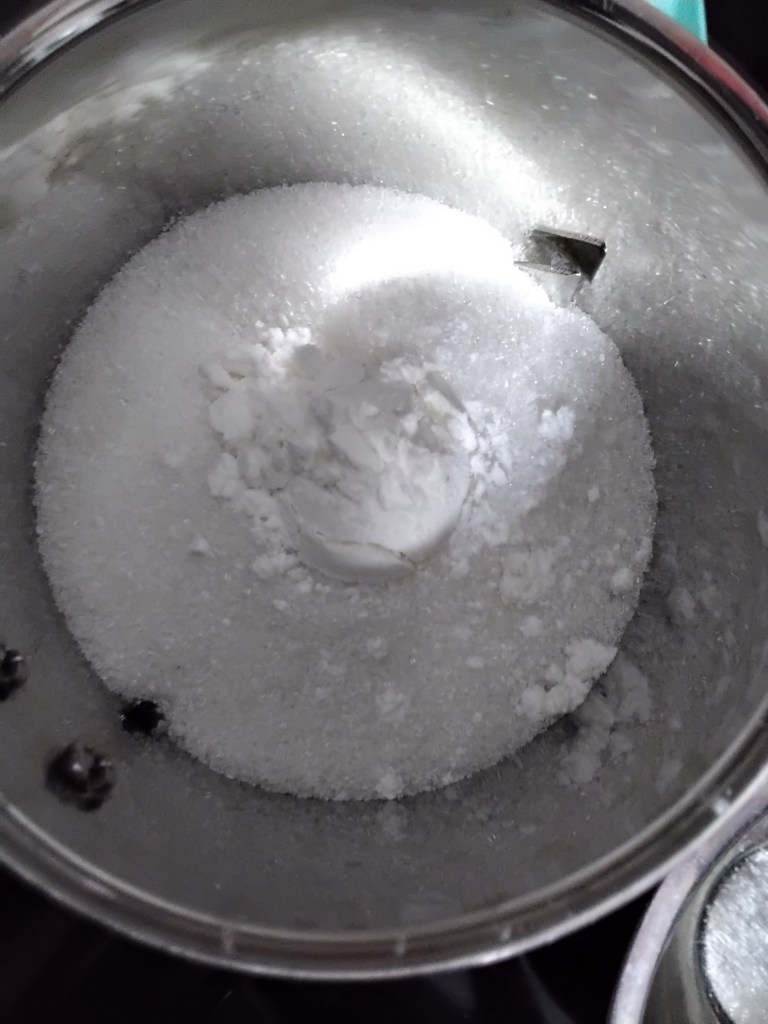 First in a blender jar, add sugar and corn flour and powder well. Adding corn flour makes sure that there is just the right amount of softness and crunchiness to the cookie.