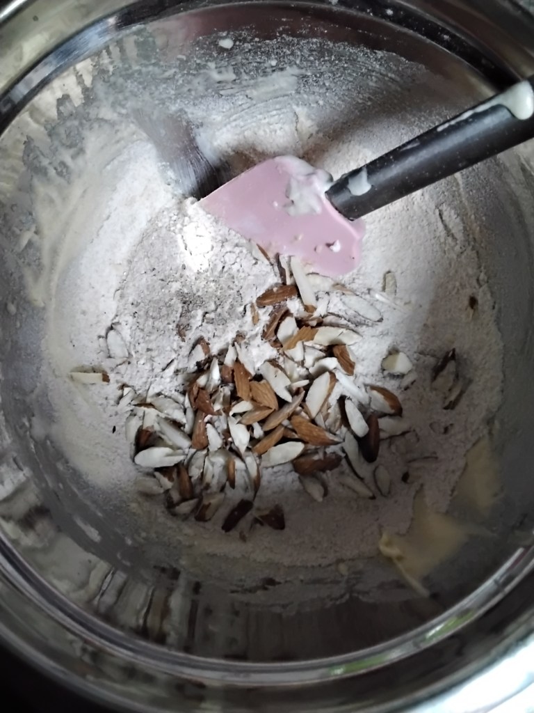 Place a sieve and add flour, baking powder, baking soda . Sieve it thoroughly and add the cardamom and almonds.