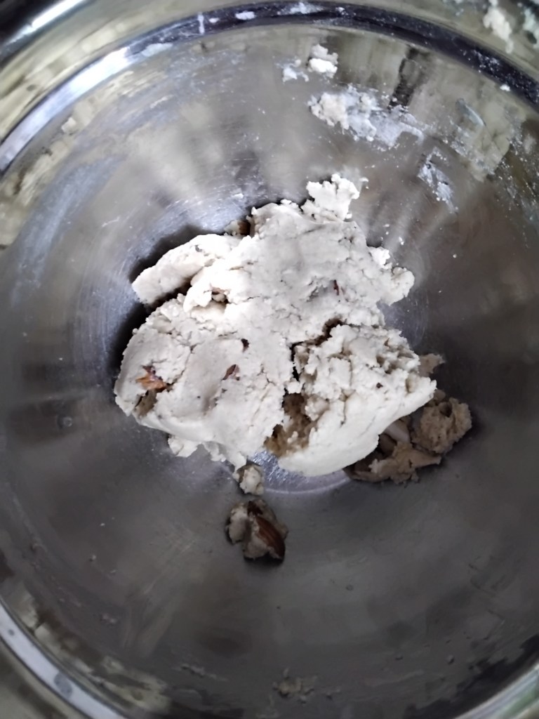 Now, mix the wet and dry ingredients well until a dough comes together. If your dough is crumbling and not holding its shape to be rolled out, add a teaspoon of milk. Check the consistency and see if it needs more.